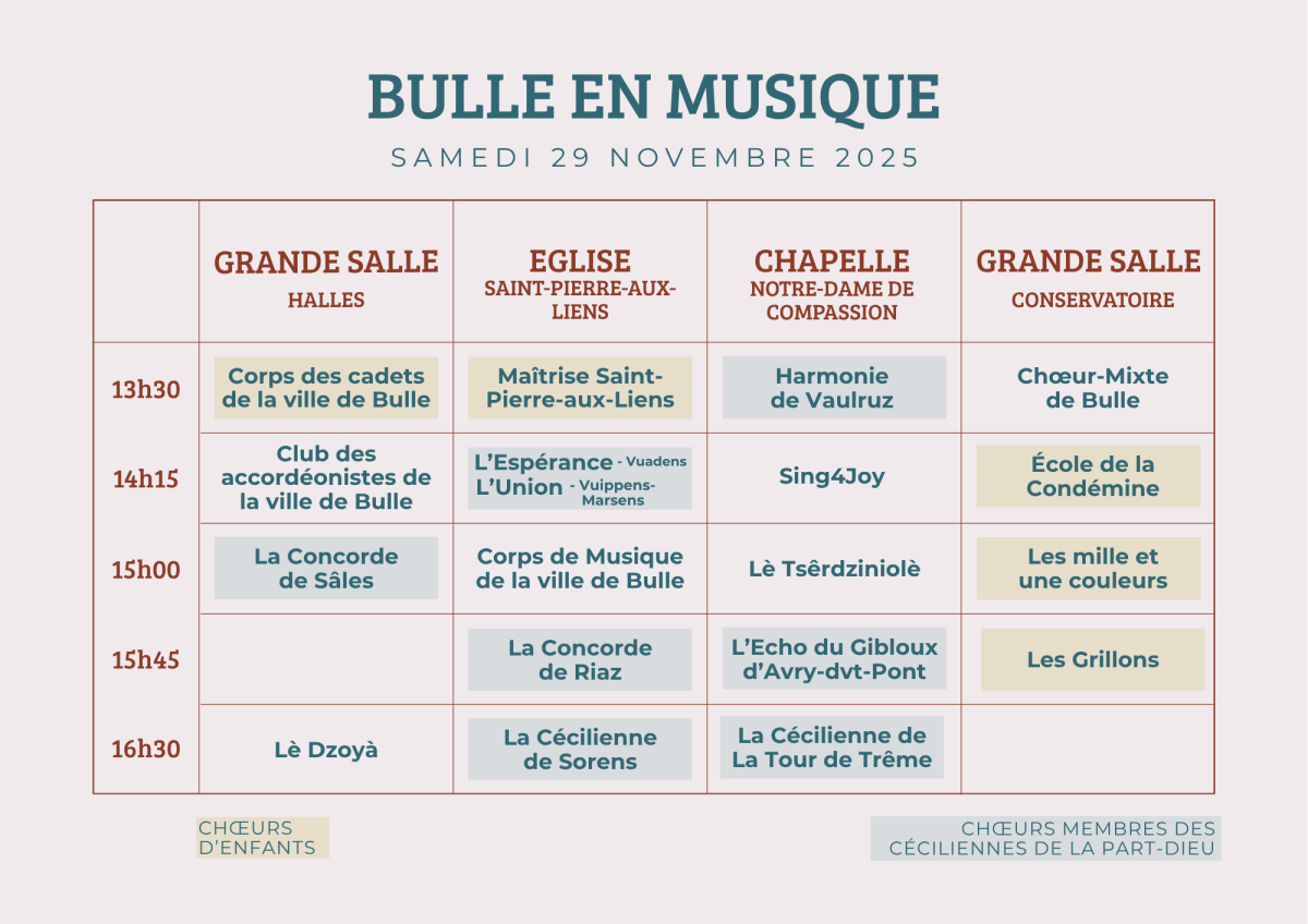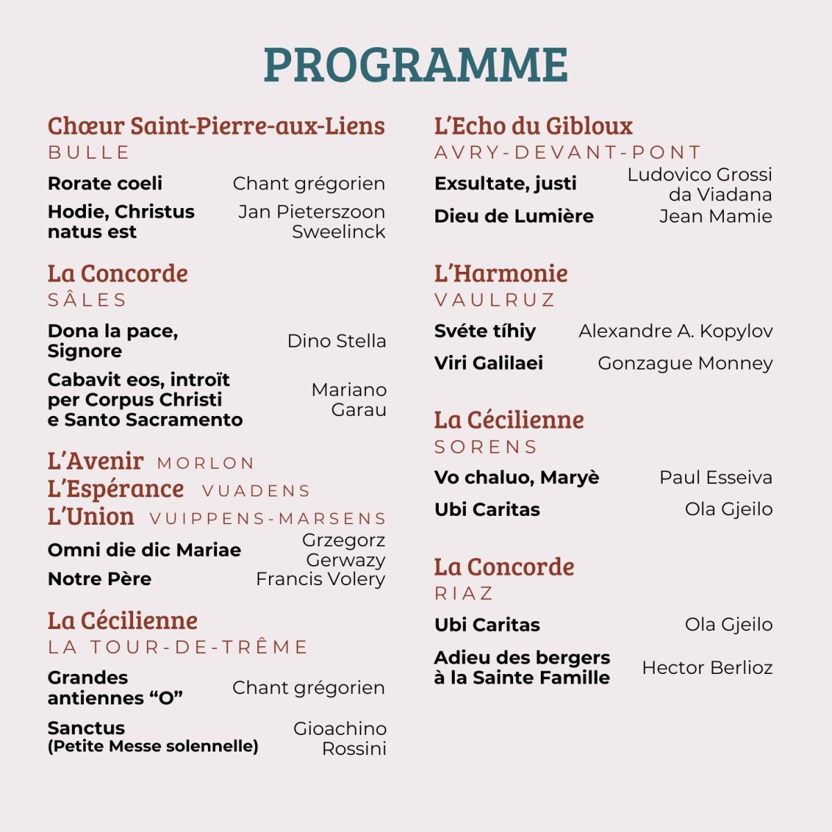 Au programme, l'opportunité d'entendre ces 10 chœurs en concert, mais aussi, d'autres ensembles musicaux bullois ! Le dimanche matin sera marqué par la création d'une messe commandée tout spécialement pour l'occasion.