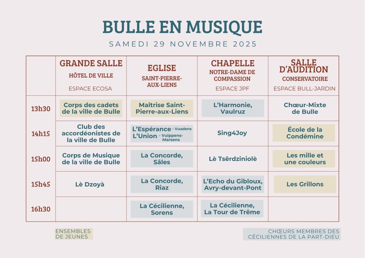 - 13h30-17h: Bulle en Musique, centre-ville de Bulle